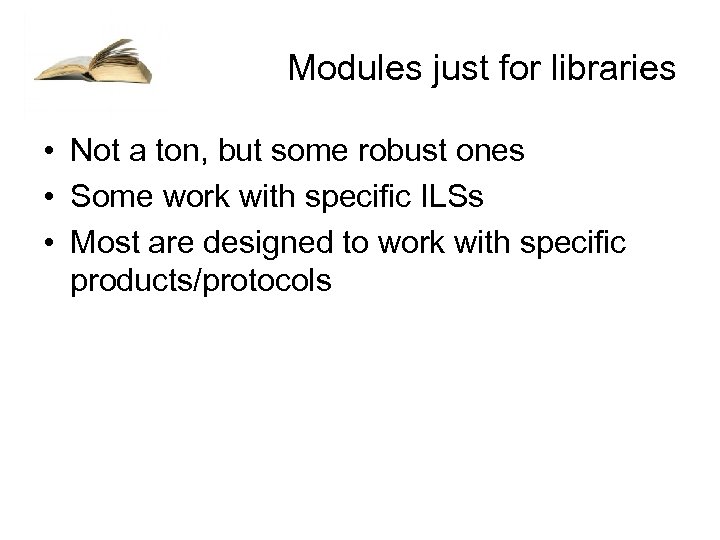 Modules just for libraries • Not a ton, but some robust ones • Some work with specific ILSs • Most are designed to work with specific products/protocols