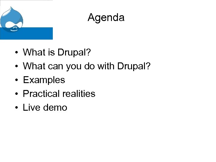 Agenda • • • What is Drupal? What can you do with Drupal? Examples Practical realities Live demo