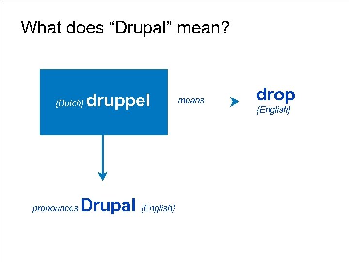 What does “Drupal” mean? {Dutch} pronounces druppel Drupal {English} means drop {English}