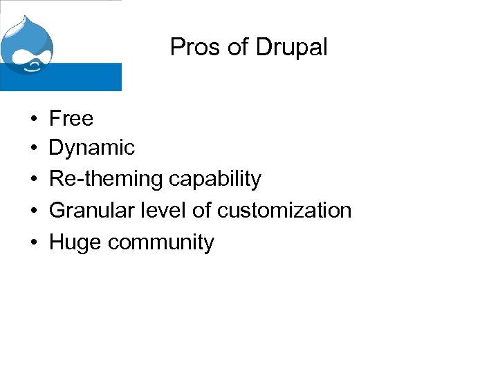 Pros of Drupal • • • Free Dynamic Re-theming capability Granular level of customization Huge community