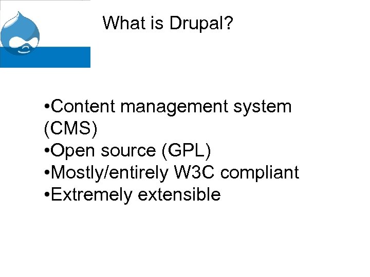 What is Drupal? • Content management system (CMS) • Open source (GPL) • Mostly/entirely W 3 C compliant • Extremely extensible