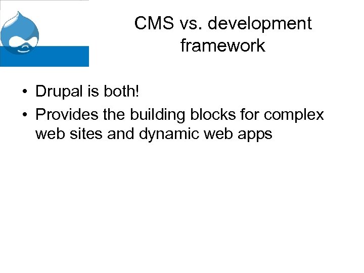 CMS vs. development framework • Drupal is both! • Provides the building blocks for complex web sites and dynamic web apps