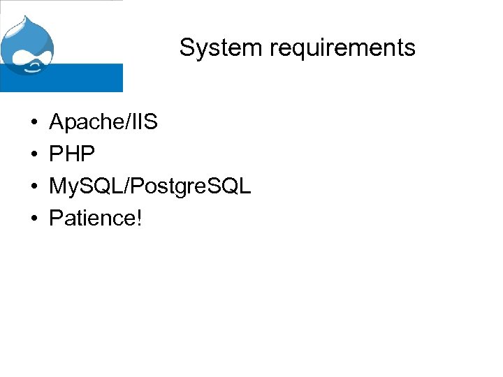 System requirements • • Apache/IIS PHP My. SQL/Postgre. SQL Patience!