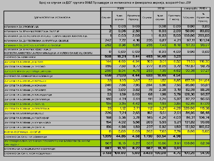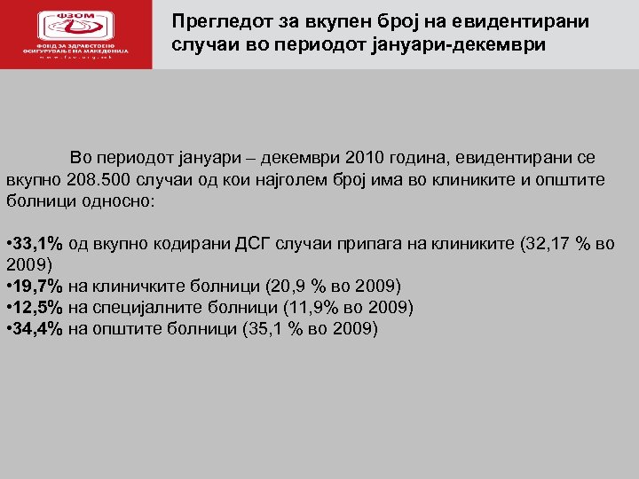 Прегледот за вкупен број на евидентирани случаи во периодот јануари-декември Во периодот јануари – декември 2010 година, евидентирани се вкупно 208. 500 случаи од кои најголем број има во клиниките и општите болници односно: • 33, 1% од вкупно кодирани ДСГ случаи припага на клиниките (32, 17 % во 2009) • 19, 7% на клиничките болници (20, 9 % во 2009) • 12, 5% на специјалните болници (11, 9% во 2009) • 34, 4% на општите болници (35, 1 % во 2009)
