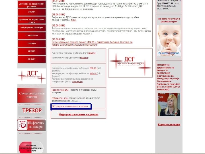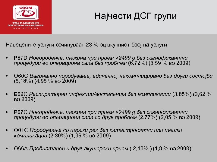 Најчести ДСГ групи а Наведените услуги сочинуваат 23 % од вкупниот број на услуги • P 67 D Новороденче, тежина прием >2499 g без сигнификантни процедури во операциона сала без проблем (6, 72%) (5, 59 % во 2009) • O 60 C Вагинално породување, единечно, некомплицирано без други состојби (5, 18%) (4, 95 % во 2009) • E 62 C Респираторни инфекции/воспаленија без компликации (3, 85%) (3, 62 % во 2009) • P 67 C Новороденче, тежина прием >2499 g без сигнификантни процедури во операциона сала со друг проблем (2, 77%) (3, 05 % во 2009) • O 01 C Породување со царски рез без катастрофални или тешки компликации (2, 30%) (1, 96 % во 2009) • O 66 A Преднатален и друг акушерски прием ( 2, 10% ) (1, 8 % во 2009)