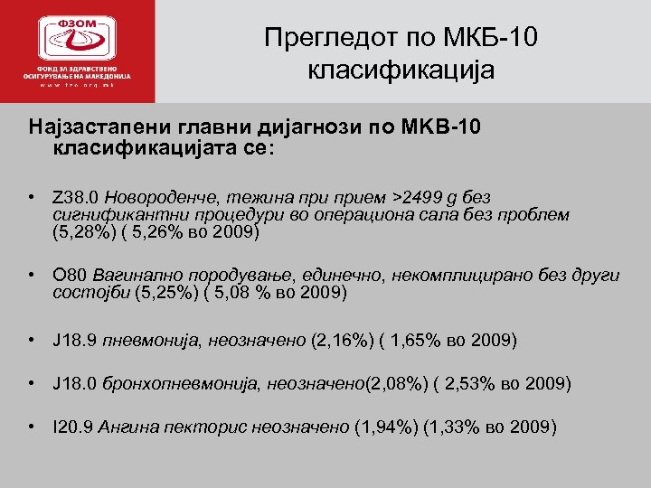 Прегледот по МКБ-10 а класификација Најзастапени главни дијагнози пo MKB-10 класификацијата се: • Z 38. 0 Новороденче, тежина прием >2499 g без сигнификантни процедури во операциона сала без проблем (5, 28%) ( 5, 26% во 2009) • O 80 Вагинално породување, единечно, некомплицирано без други состојби (5, 25%) ( 5, 08 % во 2009) • J 18. 9 пневмонија, неозначено (2, 16%) ( 1, 65% во 2009) • J 18. 0 бронхопневмонија, неозначено(2, 08%) ( 2, 53% во 2009) • I 20. 9 Ангина пекторис неозначено (1, 94%) (1, 33% во 2009)