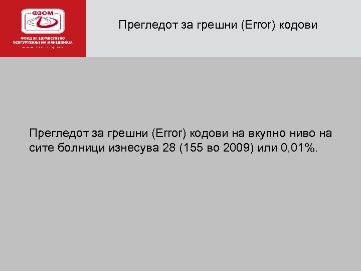 Прегледот за грешни (Error) кодови а Прегледот за грешни (Error) кодови на вкупно ниво на сите болници изнесува 28 (155 во 2009) или 0, 01%.