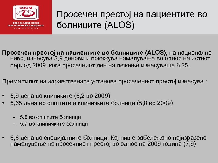Просечен престој на пациентите во а болниците (ALOS) Просечен престој на пациентите во болниците (ALOS), на национално ниво, изнесува 5, 9 денови и покажува намалување во однос на истиот период 2009, кога просечниот ден на лежење изнесуваше 6, 25. Према типот на здравствената установа просечениот престој изнесува : • 5, 9 дена во клиниките (6, 2 во 2009) • 5, 65 дена во општите и клиничките болници (5, 8 во 2009) - 5, 6 во општите болници - 5, 7 во клиничките болници • 6, 6 дена во специјалните болници. Кај нив е забележано најизразено намалување на просечниот престој во однос на 2009 година (7, 9)