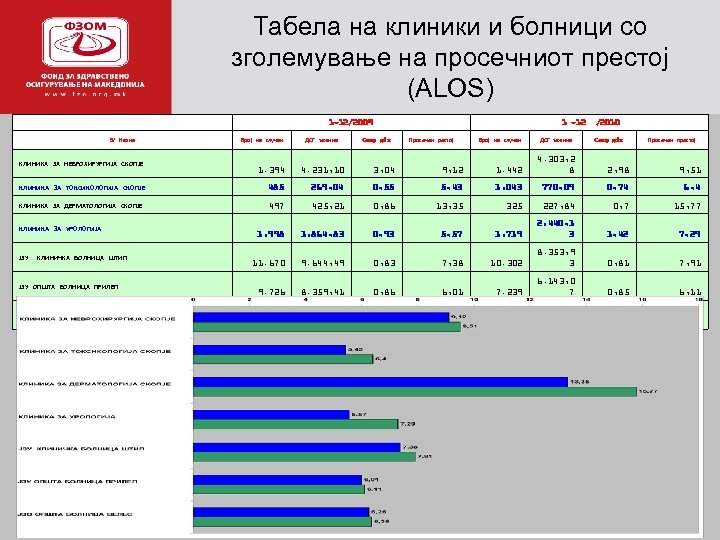 Табела на клиники и болници со зголемување на просечниот престој (ALOS) а 1 -12 1 -12/2009 ЗУ Назив Број на случаи ДСГ тежина Case mix Просечен рестој Број на случаи ДСГ тежина /2010 Case mix Просечен престој 1. 394 4. 231, 10 3, 04 9, 12 1. 442 4. 303, 2 8 2, 98 9, 51 КЛИНИКА ЗА ТОКСИКОЛОГИЈА СКОПЈЕ 485 269, 04 0, 55 5, 43 1. 043 770, 09 0, 74 6, 4 КЛИНИКА ЗА ДЕРМАТОЛОГИЈА СКОПЈЕ 497 425, 21 0, 86 13, 35 325 227, 84 0, 7 15, 77 1. 998 1. 864, 83 0, 93 5, 57 1. 719 2. 440, 1 3 1, 42 7, 29 11. 670 9. 644, 49 0, 83 7, 38 10. 302 8. 353, 9 3 0, 81 7, 91 9. 726 8. 359, 41 0, 86 6, 01 7. 239 6. 143, 0 7 0, 85 6, 11 8. 205 6. 309, 14 0, 77 6, 26 7. 339 5. 200, 6 7 0, 71 6, 36 КЛИНИКА ЗА НЕВРОХИРУРГИЈА СКОПЈЕ КЛИНИКА ЗА УРОЛОГИЈА ЈЗУ КЛИНИЧКА БОЛНИЦА ШТИП ЈЗУ ОПШТА БОЛНИЦА ПРИЛЕП ЈЗО ОПШТА БОЛНИЦА ВЕЛЕС