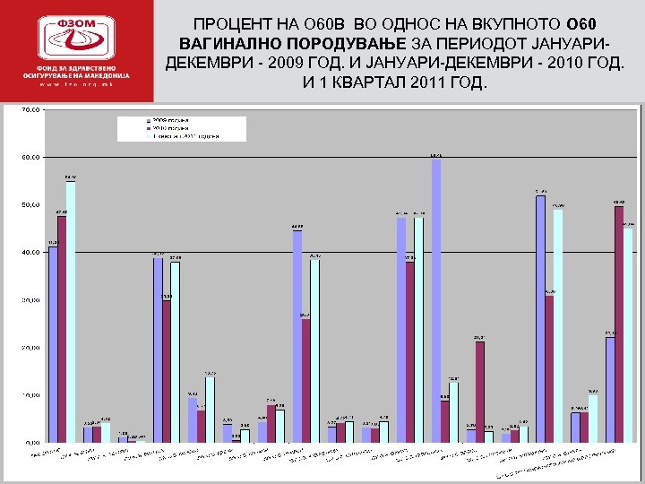 ПРОЦЕНТ НА O 60 B ВО ОДНОС НА ВКУПНОТО O 60 ВАГИНАЛНО ПОРОДУВАЊЕ ЗА ПЕРИОДОТ ЈАНУАРИДЕКЕМВРИ - 2009 ГОД. И ЈАНУАРИ-ДЕКЕМВРИ - 2010 ГОД. И 1 КВАРТАЛ 2011 ГОД. а