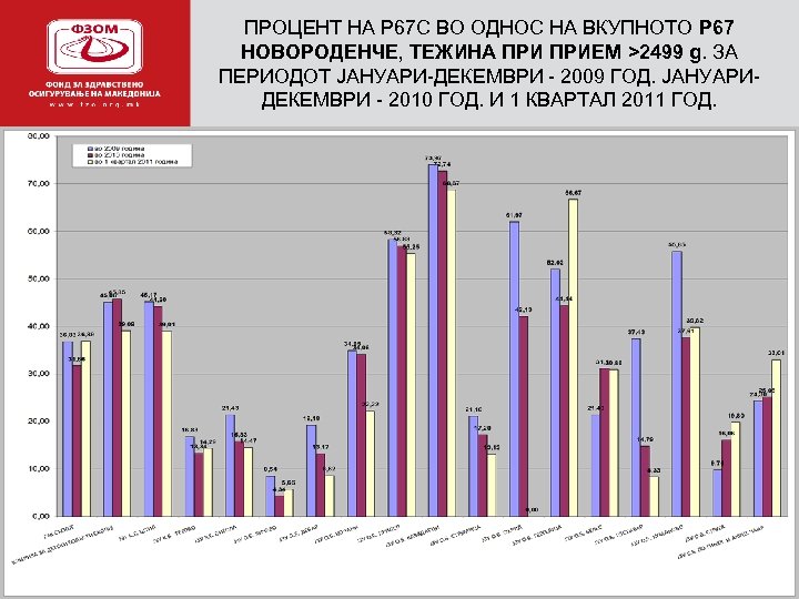 ПРОЦЕНТ НА P 67 C ВО ОДНОС НА ВКУПНОТО P 67 НОВОРОДЕНЧЕ, ТЕЖИНА ПРИЕМ >2499 g. ЗА ПЕРИОДОТ ЈАНУАРИ-ДЕКЕМВРИ - 2009 ГОД. ЈАНУАРИДЕКЕМВРИ - 2010 ГОД. И 1 КВАРТАЛ 2011 ГОД. а