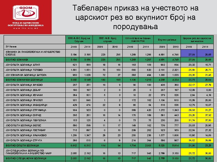 Табеларен приказ на учеството на царскиот рез во вкупниот број на породувања а O 60 -A-B-C Број на Случаи O 02 - А-B- Број случаи O 01 -A-B Број на Случаи (Царски Рез) ЗУ Назив 2009 2010 КЛИНИКА ЗА ГИНЕКОЛОГИЈА И АКУШЕРСТВО СКОПЈЕ 3. 184 3. 185 229 295 1. 268 ВКУПНО КЛИНИКИ 3. 184 3. 186 229 295 2009 569 18 ЈЗУ ОПШТА БОЛНИЦА ТЕТОВО 1. 561 1. 551 ЈЗУ КЛИНИЧКА БОЛНИЦА БИТОЛА 850 ВКУПНО КЛИНИЧКИ БОЛНИЦИ 2010 2009 2010 1. 266 4. 681 4. 746 27, 09 26, 68 1. 267 4. 681 4. 748 27, 09 26, 68 16 163 109 802 694 20, 32 15, 71 70 150 560 620 2. 191 2. 321 25, 56 26, 71 1. 028 72 27 383 484 1. 305 1. 539 29, 35 31, 45 3. 148 160 193 1. 106 1. 213 4. 298 4. 554 25, 73 26, 64 ЈЗУ ОПШТА БОЛНИЦА КИЧЕВО 297 251 19 9 90 100 406 360 22, 17 27, 78 ЈЗУ ОПШТА БОЛНИЦА ДЕБАР 180 187 2 0 25 0 207 187 12, 08 0, 00 ЈЗУ ОПШТА БОЛНИЦА КОЧАНИ 364 501 5 3 10 22 379 526 2, 64 4, 18 ЈЗУ ОПШТА БОЛНИЦА ПРИЛЕП 931 646 1 2 172 162 1. 104 810 15, 58 20, 00 ЈЗУ ОПШТА БОЛНИЦА КАВАДАРЦИ 428 474 22 8 66 54 516 536 12, 79 10, 07 ЈЗУ ОПШТА БОЛНИЦА СТРУМИЦА 904 923 0 0 368 420 1. 272 1. 343 28, 93 31, 27 ЈЗУ ОПШТА БОЛНИЦА ОХРИД 395 261 16 14 170 168 581 443 29, 26 37, 92 ЈЗУ ОПШТА БОЛНИЦА ГЕВГЕЛИЈА 153 125 4 0 73 75 230 200 31, 74 37, 50 ЈЗО ОПШТА БОЛНИЦА ВЕЛЕС 580 598 11 17 148 162 739 777 20, 03 20, 85 ЈЗУ ОПШТА БОЛНИЦА ГОСТИВАР 715 687 0 10 208 262 923 959 22, 54 27, 32 ЈЗУ ОПШТА БОЛНИЦА КУМАНОВО 1. 347 1. 299 28 23 250 236 1. 577 1. 606 15, 85 14, 69 515 6 8 214 344 586 867 36, 52 39, 68 3. 032 ЈЗУ ОПШТА БОЛНИЦА СТРУГА 366 2010 Царски рез во однос на вагинални 2009 ЈЗУ ОПШТА БОЛНИЦА ШТИП 621 2009 Вкупно раѓања ВКУПНО ОПШТИ БОЛНИЦИ 6. 612 6. 515 114 94 1. 794 2. 005 8. 520 8. 614 21, 06 23, 28 ЈЗУ СПЕЦИЈАЛНА БОЛНИЦА ПО ГИНЕКОЛОГИЈА И АКУШЕРСТВО ЧАИР 2. 055 2. 192 16 13 717 945 2. 788 3. 150 25, 72 30, 00 ВКУПНО СПЕЦИЈАЛНИ БОЛНИЦИ 2. 055 2. 192 16 13 717 945 2. 788 3. 150 25, 72 30, 00