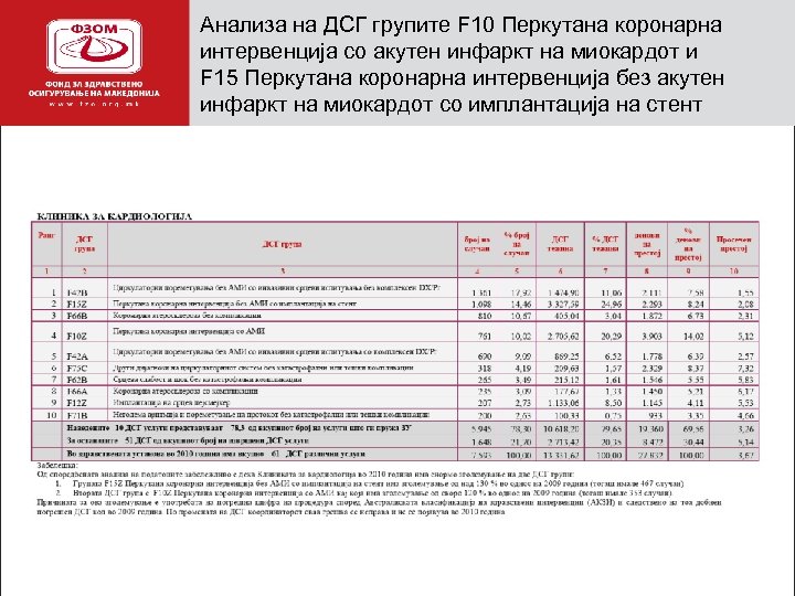 Анализа на ДСГ групите F 10 Перкутана коронарна интервенција со акутен инфаркт на миокардот и F 15 Перкутана коронарна интервенција без акутен инфаркт на миокардот со имплантација на стент а