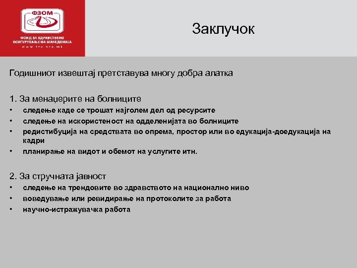 а Заклучок Годишниот извештај претставува многу добра алатка 1. За менаџерите на болниците • • следење каде се трошат најголем дел од ресурсите следење на искористеност на одделенијата во болниците редистибуција на средствата во опрема, простор или во едукација-доедукација на кадри планирање на видот и обемот на услугите итн. 2. За стручната јавност • • • следење на трендовите во здравството на национално ниво воведување или ревидирање на протоколите за работа научно-истражувачка работа