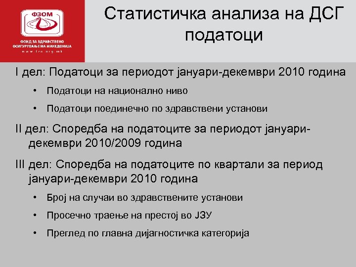 Статистичка анализа на ДСГ податоци I дел: Податоци за периодот јануари-декември 2010 година • Податоци на национално ниво • Податоци поединечно по здравствени установи II дел: Споредба на податоците за периодот јануари- декември 2010/2009 година III дел: Споредба на податоците по квартали за период јануари-декември 2010 година • Број на случаи во здравствените установи • Просечно траење на престој во ЈЗУ • Преглед по главна дијагностичка категорија