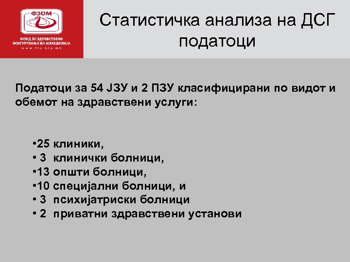 Статистичка анализа на ДСГ податоци Податоци за 54 ЈЗУ и 2 ПЗУ класифицирани по видот и обемот на здравствени услуги: • 25 клиники, • 3 клинички болници, • 13 општи болници, • 10 специјални болници, и • 3 психијатриски болници • 2 приватни здравствени установи