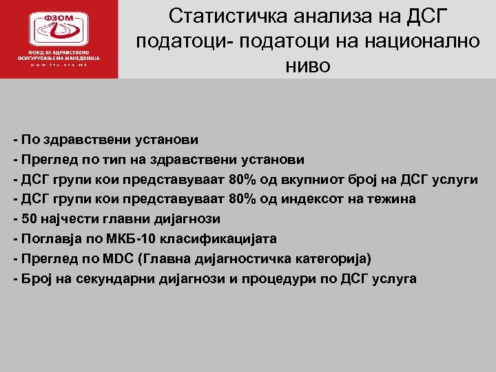 Статистичка анализа на ДСГ податоци- податоци на национално а ниво - По здравствени установи - Преглед по тип на здравствени установи - ДСГ групи кои представуваат 80% од вкупниот број на ДСГ услуги - ДСГ групи кои представуваат 80% од индексот на тежина - 50 најчести главни дијагнози - Поглавја по МКБ-10 класификацијата - Преглед по MDC (Главна дијагностичка категорија) - Број на секундарни дијагнози и процедури по ДСГ услуга