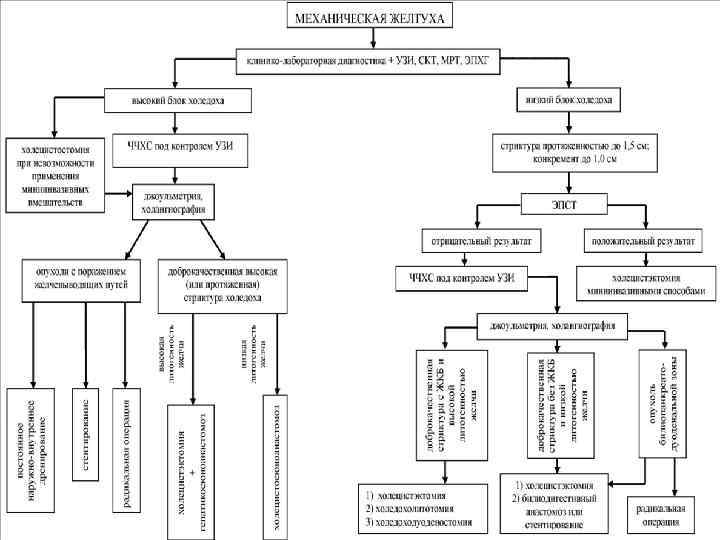 Выбор метода диагностики во многом зависит от предполагаемой области обтурации желчевыводящих путей, характера патологического процесса, диагностической эффективности метода (его чувствительности, специфичности и общей точности), частоты возможных осложнений. Алгоритм диагностики пациентов с МЖ