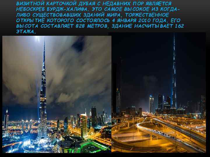 ВИЗИТНОЙ КАРТОЧКОЙ ДУБАЯ С НЕДАВНИХ ПОР ЯВЛЯЕТСЯ НЕБОСКРЕБ БУРДЖ-ХАЛИФА. ЭТО САМОЕ ВЫСОКОЕ ИЗ КОГДАЛИБО СУЩЕСТВОВАВШИХ ЗДАНИЙ МИРА, ТОРЖЕСТВЕННОЕ ОТКРЫТИЕ КОТОРОГО СОСТОЯЛОСЬ 4 ЯНВАРЯ 2010 ГОДА. ЕГО ВЫСОТА СОСТАВЛЯЕТ 828 МЕТРОВ, ЗДАНИЕ НАСЧИТЫВАЕТ 162 ЭТАЖА.