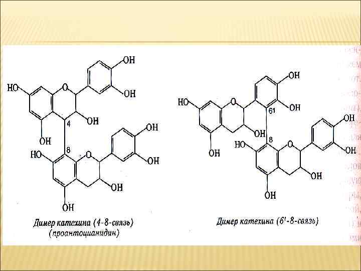 КЛАССИФИКАЦИЯ ДУБИЛЬНЫХ ВЕЩЕСТВ Г. К. Проктер: пирогаллоловые и пирокатехиновые – в зависимости от продуктов разложения при 180 -200 град. С К. Фрейденберг: гидролизуемые и конденсированные – по отношению к воздействию кислот. Гидролизуемы ДВ расщипляются на галловую кислоту; конденсированные образуются в результате ферментативной конденсации катехинов, лейкоантоцианидинов, оксистильбенов