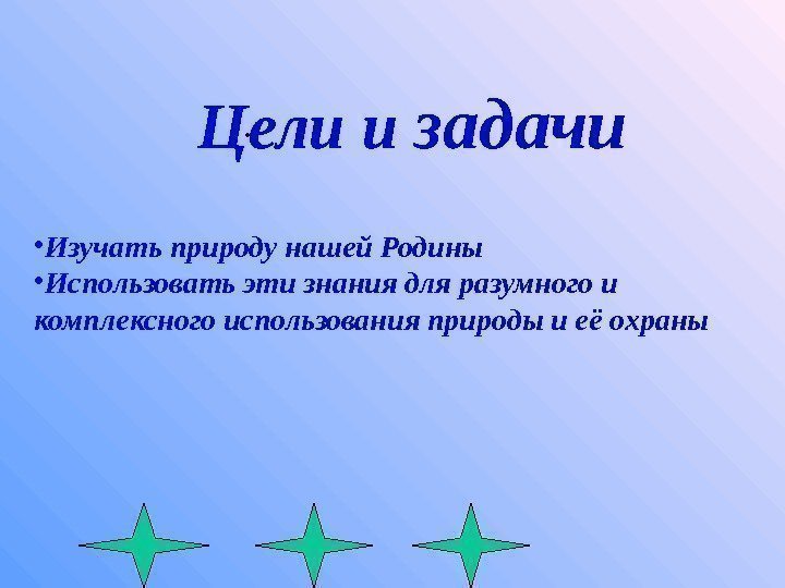 . Цели и задачи • Изучать природу нашей Родины • Использовать эти знания для разумного и комплексного использования природы и её охраны