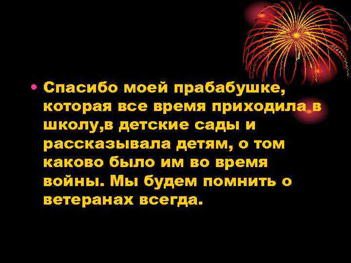 • Спасибо моей прабабушке, которая все время приходила в школу, в детские сады и рассказывала детям, о том каково было им во время войны. Мы будем помнить о ветеранах всегда.