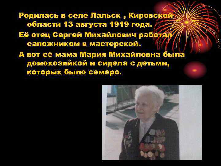 Родилась в селе Лальск , Кировской области 13 августа 1919 года. Её отец Сергей Михайлович работал сапожником в мастерской. А вот её мама Мария Михайловна была домохозяйкой и сидела с детьми, которых было семеро.