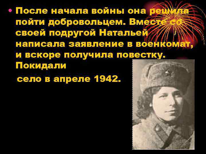 • После начала войны она решила пойти добровольцем. Вместе со своей подругой Натальей написала заявление в военкомат, и вскоре получила повестку. Покидали село в апреле 1942.