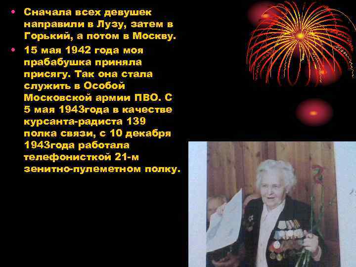 • Сначала всех девушек направили в Лузу, затем в Горький, а потом в Москву. • 15 мая 1942 года моя прабабушка приняла присягу. Так она стала служить в Особой Московской армии ПВО. С 5 мая 1943 года в качестве курсанта-радиста 139 полка связи, с 10 декабря 1943 года работала телефонисткой 21 -м зенитно-пулеметном полку.