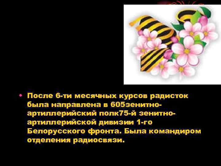 • После 6 -ти месячных курсов радисток была направлена в 605 зенитноартиллерийский полк 75 -й зенитноартиллерийской дивизии 1 -го Белорусского фронта. Была командиром отделения радиосвязи.