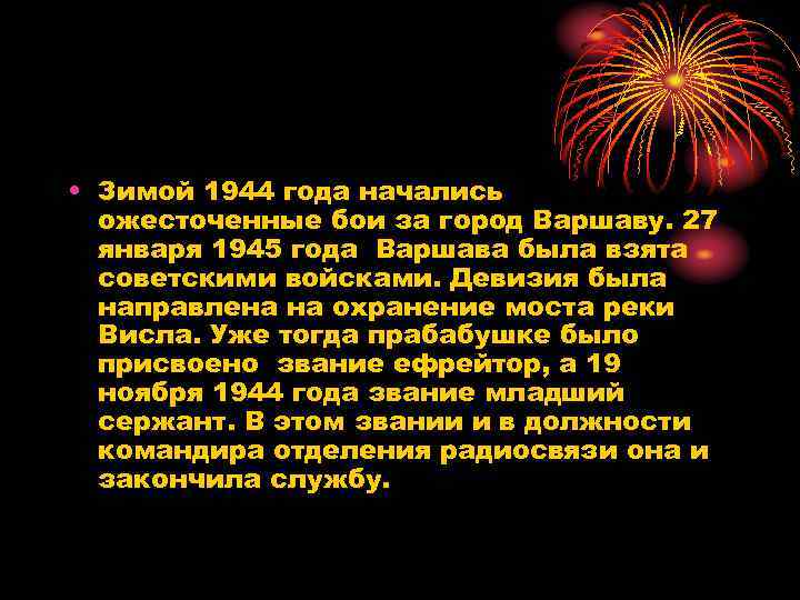 • Зимой 1944 года начались ожесточенные бои за город Варшаву. 27 января 1945 года Варшава была взята советскими войсками. Девизия была направлена на охранение моста реки Висла. Уже тогда прабабушке было присвоено звание ефрейтор, а 19 ноября 1944 года звание младший сержант. В этом звании и в должности командира отделения радиосвязи она и закончила службу.
