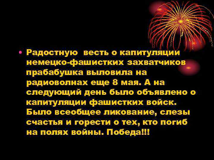 • Радостную весть о капитуляции немецко-фашистких захватчиков прабабушка выловила на радиоволнах еще 8 мая. А на следующий день было объявлено о капитуляции фашистких войск. Было всеобщее ликование, слезы счастья и горести о тех, кто погиб на полях войны. Победа!!!
