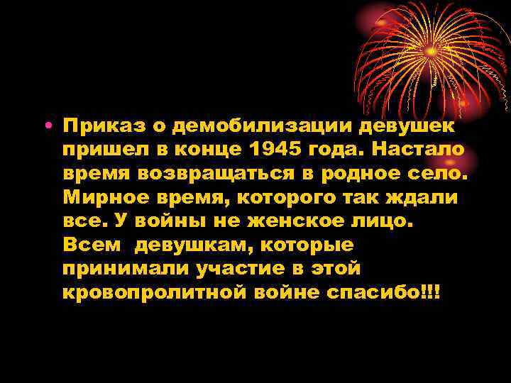 • Приказ о демобилизации девушек пришел в конце 1945 года. Настало время возвращаться в родное село. Мирное время, которого так ждали все. У войны не женское лицо. Всем девушкам, которые принимали участие в этой кровопролитной войне спасибо!!!