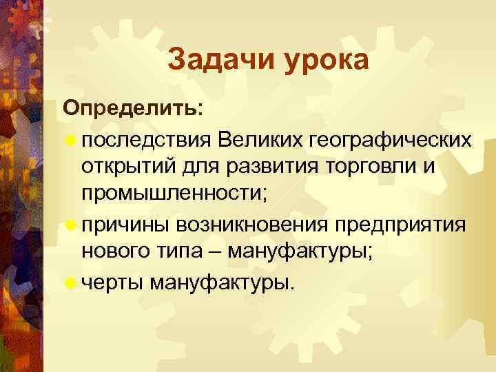 Задачи урока Определить: ® последствия Великих географических открытий для развития торговли и промышленности; ® причины возникновения предприятия нового типа – мануфактуры; ® черты мануфактуры.