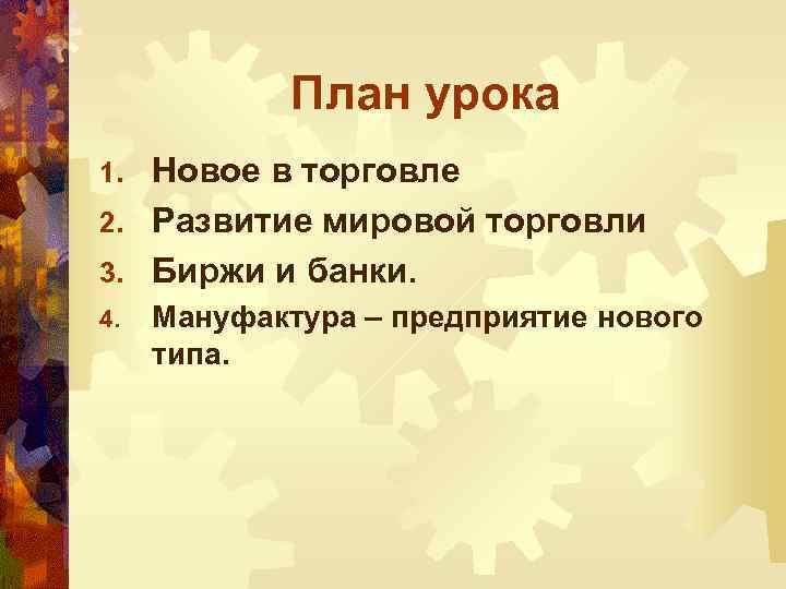 План урока Новое в торговле 2. Развитие мировой торговли 3. Биржи и банки. 1. 4. Мануфактура – предприятие нового типа.