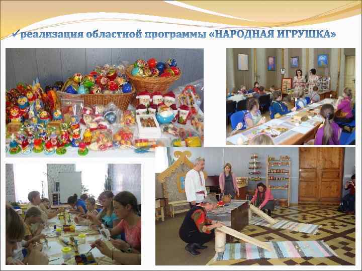 Социальный проект «Народная игрушка. От сердца к сердцу» ЦЕЛИ И ЗАДАЧИ ПРОГРАММЫ: • сохранение и развитие народных промыслов; • обучение по изготовлению и производство традиционной народной игрушки; • обеспечение дошкольных детских учреждений традиционными развивающими играми и игрушками; • организация повышения квалификации педагогических кадров дошкольных, специальных (коррекционных) учреждений, распространение опыта по использованию народной игрушки в педагогическом процессе; • популяризация и продвижение на межрегиональном и федеральном уровне бренда «Костромская игрушка»