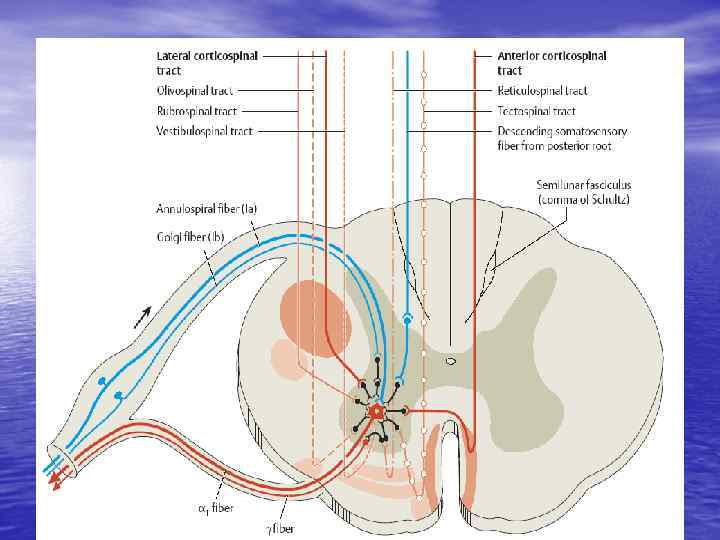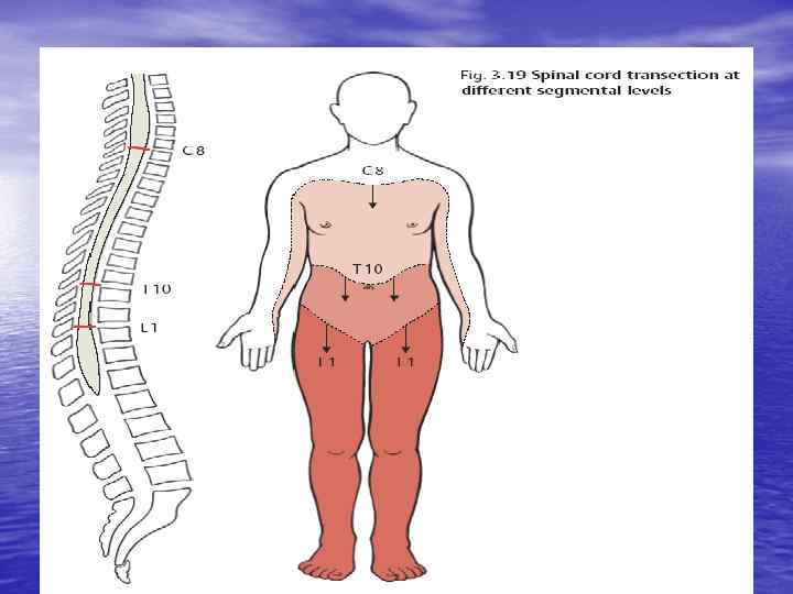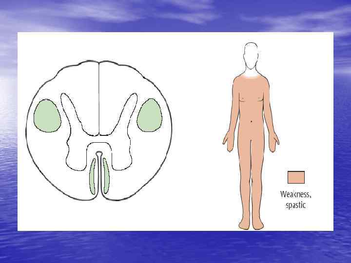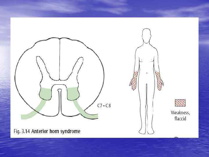 Периферический мотонейрон (передние рога) • Периферический паралич мышц, иннервируемых данным сегментом • Паралич грубее выражен в проксимальных отделах конечностей • Фибриллярные подергивания мышц, иннервируемых данным мотонейроном