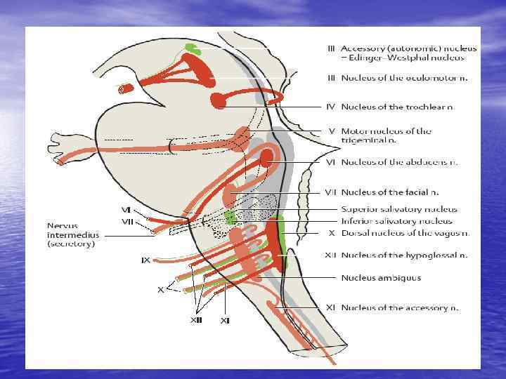 ЧМН • Клетки Беца нижней части прецентральной • • • извилины Лучистый венец Колено капсулы Центральные (корково-ядерные волокна) переходят на противоположную сторону на разных уровнях ствола. Имеют двустороннюю корково-ядерную иннервацию (кроме 7 и 12 пар ЧМН)