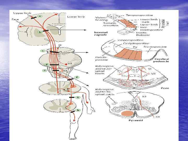 Симптомокомплексы, возникающие при поражении корково-мышечного пути на различных уровнях • Кора • Внутренняя капсула • Мозговой ствол • Спинной мозг • Периферический нерв • Синапс • Мышцы
