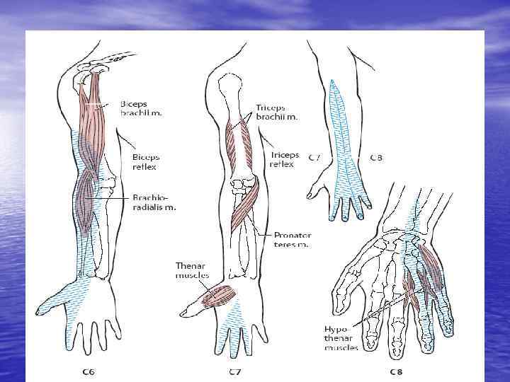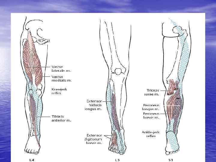 Поверхностные рефлексы • Брюшные (верхний, средний, нижний) Верхний – D 7 -D 8 Средний – D 9 -D 10 Нижний – D 11 -D 12 • Подошвенный рефлекс – L 5 -S 2