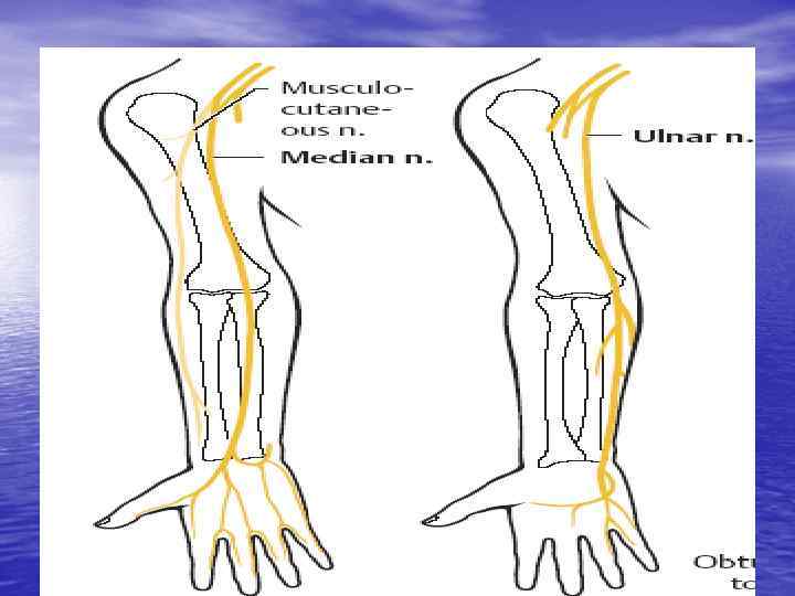Периферический паралич (парез) • Снижение мышечного тонуса • Снижение (отсутствие) глубоких рефлексов • Гипотрофия (атрофия мышц) – становится заметной через 2 -3 недели • ЭМГ – поражение нерва