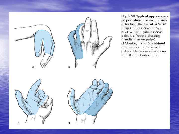 Невральный тип • Парезы мышц, иннервируемых данным • • • нервом и патогномоничные нарушения движений Поражение лучевого нерва – «свисающая кисть» Поражение локтевого – «когтистая лапа» Поражение срединного – «обезьянья кисть» Малоберцового – «свисающая стопа» Большеберцового – пяточная стопа или «молоткообразные пальцы»