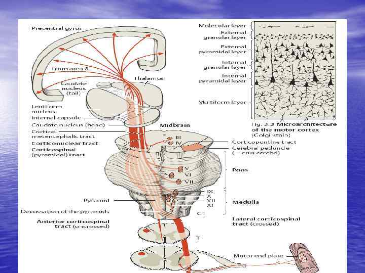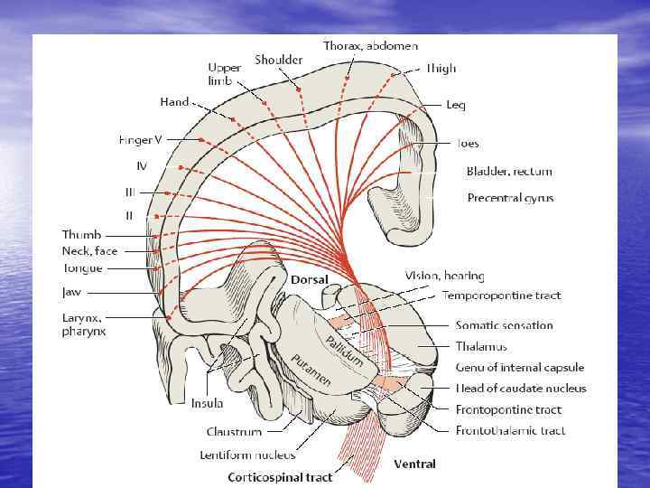 I нейрон • Клетки Беца – 5 слой прецентральной извилины, лобной доли • Лучистый венец (нервные волокна от коры до капсулы) • Капсула (компактный пучок - белое вещество между головкой • • • хвостатого, чечевицеобразного ядра и таламуса) Ножки мозга Мост (основание) Пирамиды продолговатого мозга Перекрест пирамид (граница продолговатого и спинного мозга) Боковой канатик спинного мозга (пирамидный путь латеральный, перекрещенный). Передний канатик спинного мозга (неперекрещенный пирамидный путь). В руках преобладает перекрестная иннервация