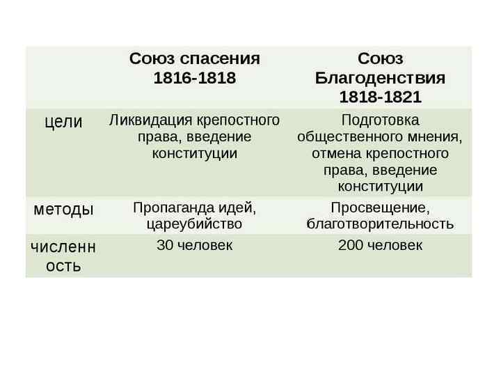 СОЮЗ БЛАГОДЕНСТВИЯ В январе 1818 г. был образован «Союз благоденствия» возглавлялся Коренной управой (30 учредителей) и Думой (6 человек). Им подчинялись «деловые управы» и «побочные управы» в Петербурге, Москве, Тульчине, Полтаве, Тамбове, Смоленске, Нижнем Новгороде, Кишинёве. Около 200 членов. Хотели за 20 лет подготовить «передовое общественное мнение» для того, чтобы совершить бескровный политический переворот. Планировали создавать просветительские, литературные общества.