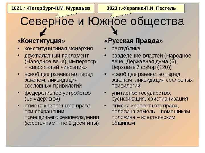 «Орден русских рыцарей» (граф М. А. Дмитриев-Мамонов, генерал М. Ф. Орлов) Организация ставила цель учреждение в России конституционной монархии путем ограничения самодержавия 1. Ограничение самодержавной власти лишением права издавать новые законы и отменять старые без воли, лишением права налагать налоги без согласия, лишением права объявлять войну и заключать трактаты, лишением права ссылать и наказывать, лишением права оставлять государство и отъезжать за границу, лишением права жаловать в княжеское и графское Российское достоинство, в фельдмаршалы, в канцлеры, в государственные министры, в генерал-губернаторы и др. согласия Сената. 2. Учреждение Сената, составленного из 200 наследственных перов, магнатов или вельмож государства, из 400 представителей дворянства и из 400 представителей народа. 3. Дарование 200 наследственным вельможам государства уделов городами и поместьями. 4. Конечное и всегдашнее истребление имени Польша и Королевства Польского и обращение всей Польши, как Прусской, так и Австрийской, в губернии Российские. 5. Присоединение Венгрии, Сербии, всех славянских народов к России. 6. Изгнание Турков из Европы и восстановление греческих республик под протекторатом России. 8. Упразднение рабства в России; 9. Вольное книгопечатание. 10. Общее размежевание земель в России и раздача оных по государственным уважениям частным людям. 11. Лишение иноземцев всякого влияния на дела государственные. 12. Сочинение проекта выгодной войны против Персиян и вторжения в Индию. 13. Улучшение состояния солдата.