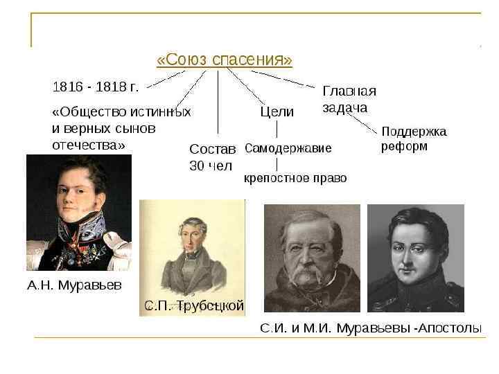 СОЮЗ СПАСЕНИЯ 9 февраля 1816 г. члены Священной и Семёновской артелей объединились в первую декабристскую организацию, получившую название «Союз спасения» . Учредителями и организаторами общества были гвардейские офицеры А. Н. Муравьёв, М. Муравьёв-Апостол и С. Муравьёв. Апостол, князь Сергей Трубецкой. Помимо членов Семёновской и Священной артелей, в состав общества вошли Н. М. Муравьёв, П. П. Пестель, майор М. С. Лунин, полковник Ф. Н. Глинка. Во главе «Союза спасения» стоял Верховный собор из «бояр» . Остальные участники делились на «мужей» и «братьев» , которых предполагалось сгруппировать по «округам» и «управам» . Однако этому помешала малочисленность общества, насчитывавшего не более 30 членов. Была принята глубокая конспирация, беспрекословное подчинение нижестоящих членов вышестоящим. Принятие новых членов и переход членов из одной ступени в другую осуществлялся при согласии «бояр» . Масонские ритуалы: • 3 ступени для членства • Торжественная клятва на кресте и Евангилие