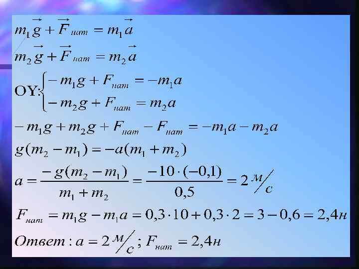 Задача № 2 На шнуре, перекинутом через неподвижный блок, подвешены грузы массами 0, 3 и 0, 2 кг. С каким ускорением движутся грузы? Какова сила натяжения шнура во время движения?