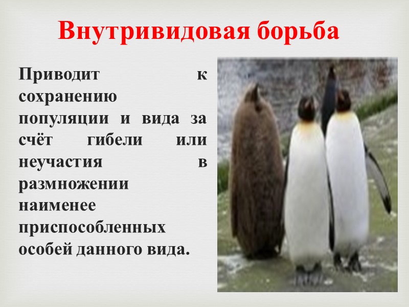 Внутривидовая борьба Приводит к сохранению популяции и вида за счёт гибели или неучастия в размножении наименее приспособленных особей данного вида.