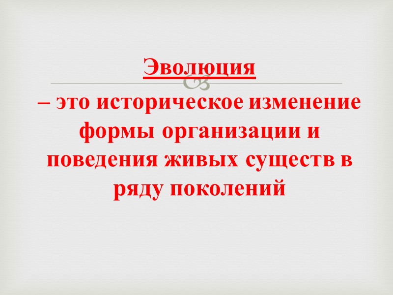 Эволюция – это историческое изменение формы организации и поведения живых существ в ряду поколений