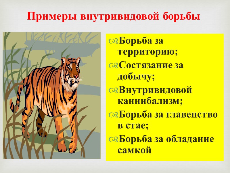 Примеры внутривидовой борьбы Борьба за территорию; Состязание за добычу; Внутривидовой каннибализм; Борьба за главенство в стае; Борьба за обладание самкой
